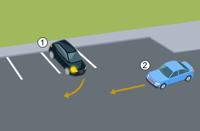 Ar „1“ automobilio vairuotojas, išvažiuodamas iš savo stovėjimo vietos, privalo duoti kelią atvažiuojančiam „2“ automobiliui?